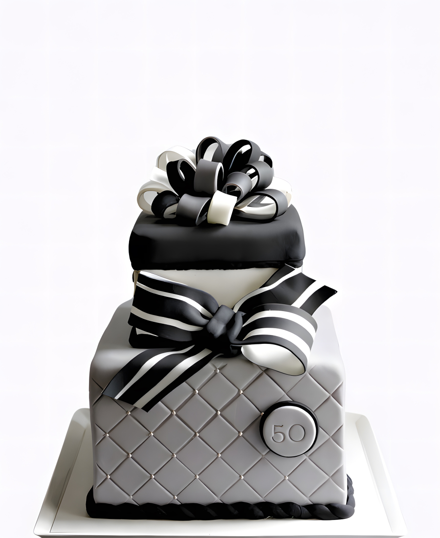 Элегантный двухъярусный торт в строгой черно-белой гамме. Контрастные геометрические узоры создают современный графичный образ. Изысканный атласный бантик добавляет торжественности композиции. Четкие линии и лаконичность форм подчеркивают статус именника. Монохромная палитра выглядит стильно и утонченно.