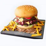 Этот торт — настоящая иллюзия аппетитного фастфуда! Объемный гамбургер с детализированной булочкой, сочной котлетой, ломтиками сыра и овощами выглядит как настоящий. Рядом — золотистая картошка фри в стилизованной упаковке. Яркие цвета и текстуры мастики создают эффект съедобного шедевра, который удивит и развеселит гостей. Игривая и реалистичная подача превращает десерт в центр внимания на любом празднике.