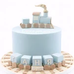 Голубой торт в виде железной дороги с паровозиком и вагончиками