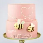 Нежный розовый торт в два яруса, украшенный белоснежной мастикой. Верхний ярус венчает объемное сердечко, а по бокам расположились милые пчелки с желтыми полосками. Торт декорирован тонкими узорами и перламутровыми бусинами, создающими праздничное настроение. Идеальный вариант для романтического торжества или детского праздника.