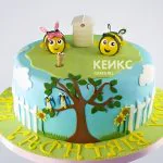 Торт «С пчелками на лужайке» – это очаровательный десерт, оформленный в природном стиле. Основа торта покрыта нежным зеленым кремом, имитирующим траву, с яркими цветами из мастики. На поверхности «лужайки» расположились забавные пчелки из мастики, создающие игривое настроение. Одноярусный торт выглядит аккуратно и гармонично, идеально подходит для детского праздника или летнего торжества.
