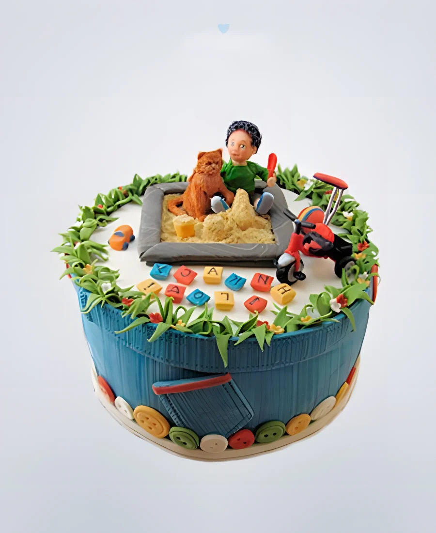 Торт в виде песочницы с мальчиком и котом