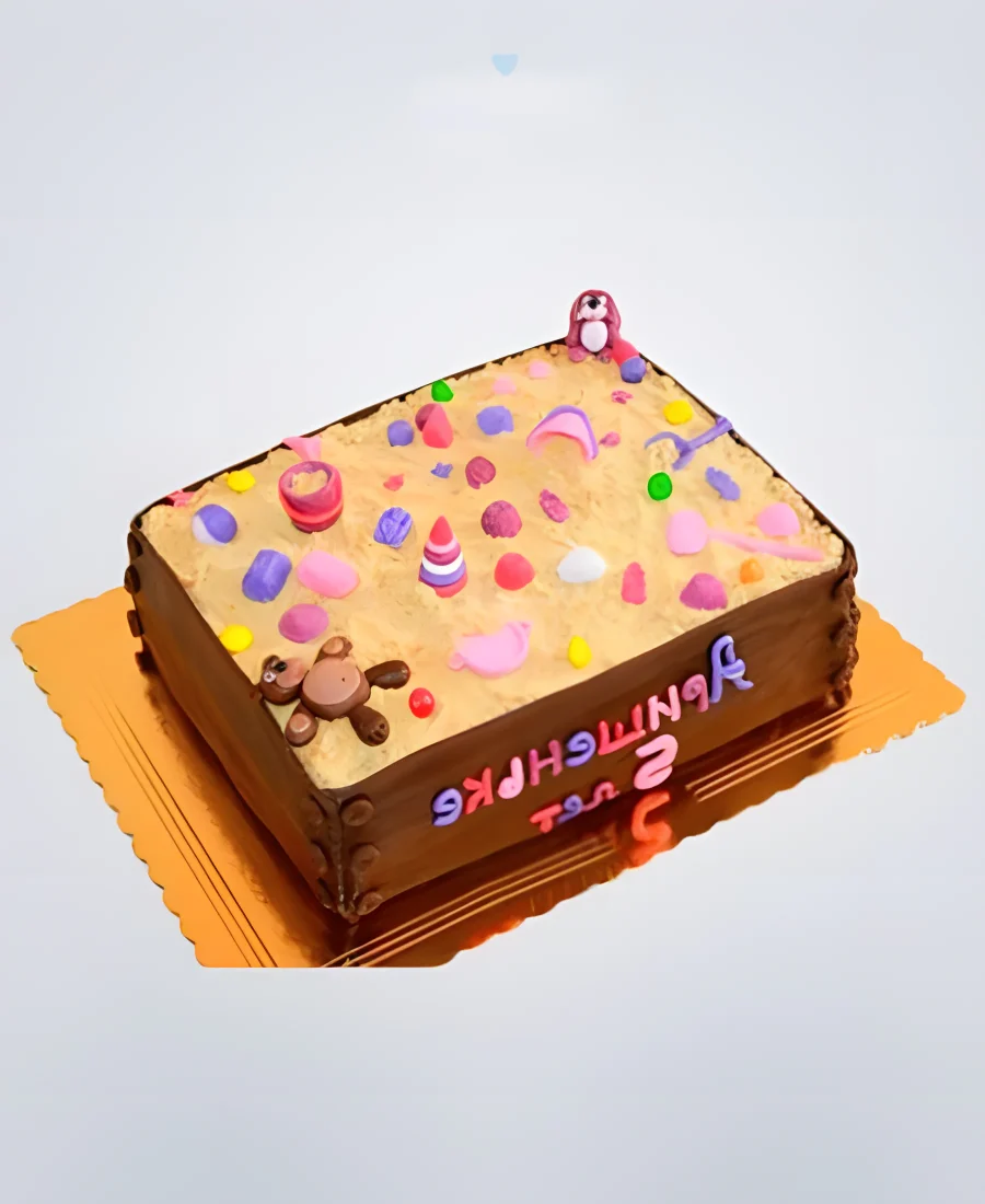 Торт в виде большой песочницы с розовыми игрушками