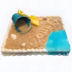 Квадратный торт в нежных песочных тонах напоминает морской берег. По всей поверхности рассыпаны изящные ракушки и морские звезды, создавая ощущение легкой летней прогулки вдоль кромки воды. Аппликации из крема добавляют объем и динамику композиции, словно волны только что оставили эти сокровища на песке. Светлые оттенки бежевого и кремового вызывают ассоциации с теплым песком и морской пеной.