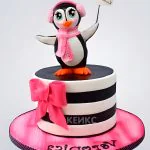 Полосатый торт с фигуркой пингвина и розовым бантом