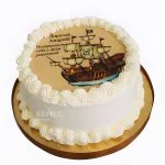 Этот торт – настоящий пиратский корабль, плывущий по кремовым волнам! Темно-синие и золотые оттенки создают атмосферу морских приключений. Фотопечать с изображением парусов и пиратской символики добавляет реалистичности. Круглая форма торта напоминает штурвал, а кремовые волны будто шепчут истории о затерянных сокровищах. Такой торт мгновенно переносит в мир отважных капитанов и таинственных островов.
