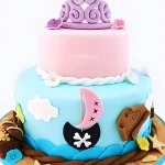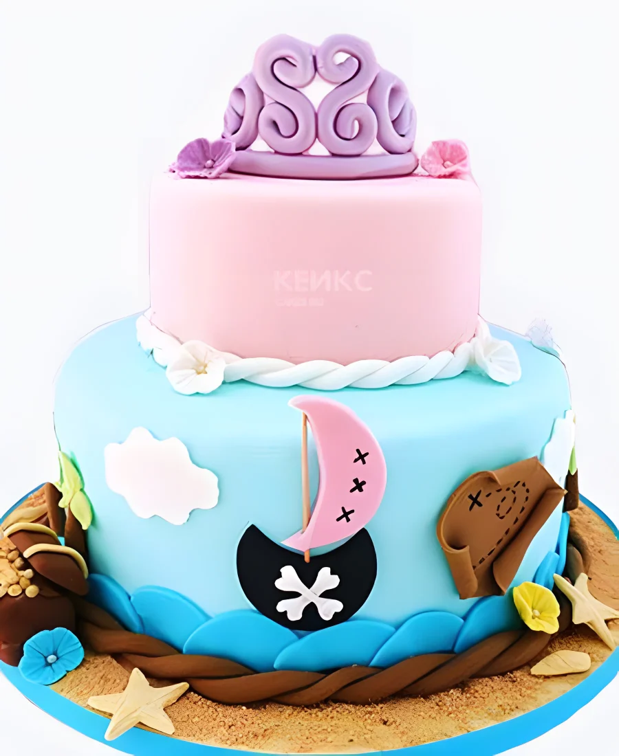 Двухъярусный торт с пиратским кораблем и розовой короной для девочки