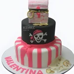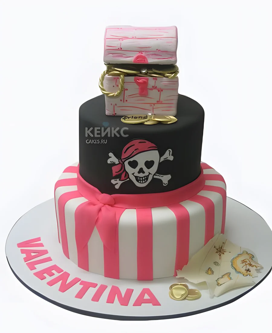 Черно-розовый торт с пиратом и сундуком с богатством