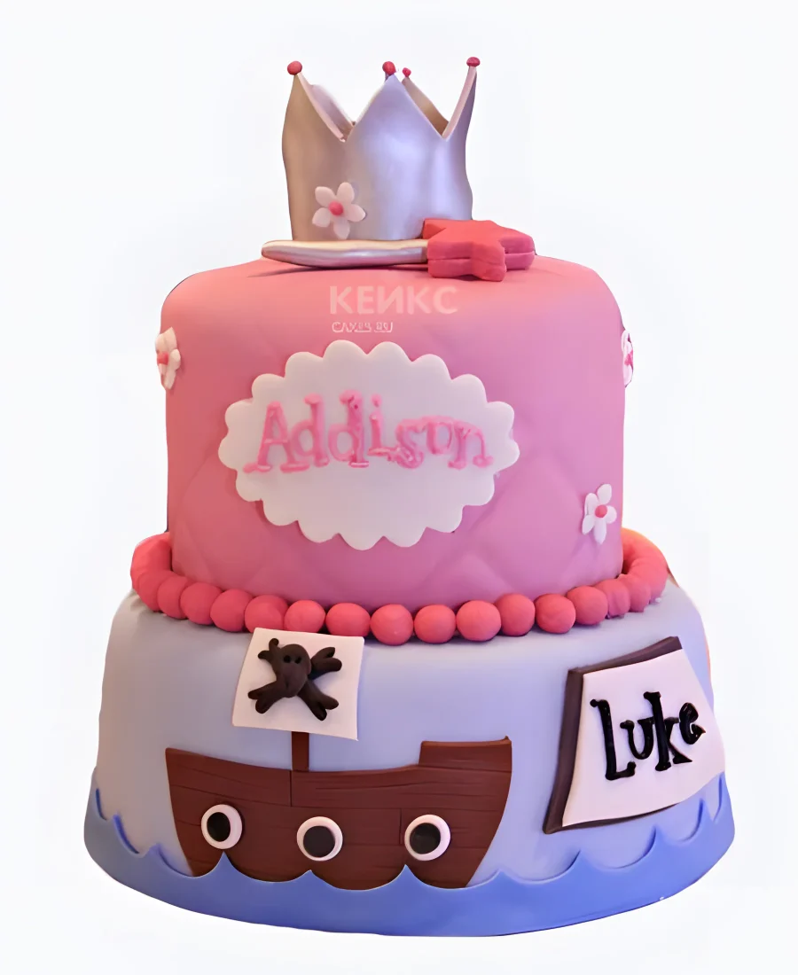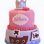Яркий розовый торт с пиратским кораблем и короной