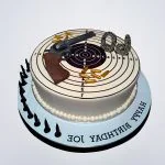 На темном фоне торта контрастно выделяется яркая мишень с фотопечатью. Вокруг нее расположены объемные патроны из мастики, создающие динамичную композицию. Черно-красная цветовая гамма передает атмосферу стрелковой тематики, а детализация элементов вызывает восторг у ценителей оригинального декора.