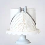Этот торт выглядит как изящное белое платье с мягкими складками и нежным серым бантиком. Его гладкая поверхность напоминает шелк, а аккуратные детали создают ощущение легкости и воздушности. Сдержанная цветовая гамма в белых и серых тонах придает торту элегантность и утонченность. Кажется, будто перед тобой миниатюрное свадебное платье, воплощенное в сладком десерте.
