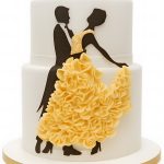 На двухъярусном торте, покрытом гладкой мастикой, изображена стильная аппликация. На белоснежном фоне ярко выделяется силуэт девушки в пышном желтом платье. Её образ дополняют изящная шляпка и зонтик, создавая легкое, летнее настроение. Чистая цветовая гамма и графичный декор придают композиции современный и лаконичный вид.