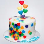 Нежный белоснежный торт украшен яркими разноцветными сердечками, создающими радостную атмосферу праздника. Цветные акценты гармонично сочетаются с чистой белизной мастики, образуя игривый и трогательный визуальный образ. Композиция из разноцветных элементов придает торту особое очарование и праздничное настроение.