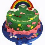 Нежный круглый торт, полностью покрытый белоснежной мастикой. По всему периметру расположились яркие радужные полосы, создающие праздничное настроение. Каждая цветная дуга идеально ровная и гладкая, образуя гармоничный разноцветный круг. Легкие облачка из мастики дополняют воздушную композицию. Яркая палитра и чистая белизна фона создают ощущение детской радости и волшебства.
