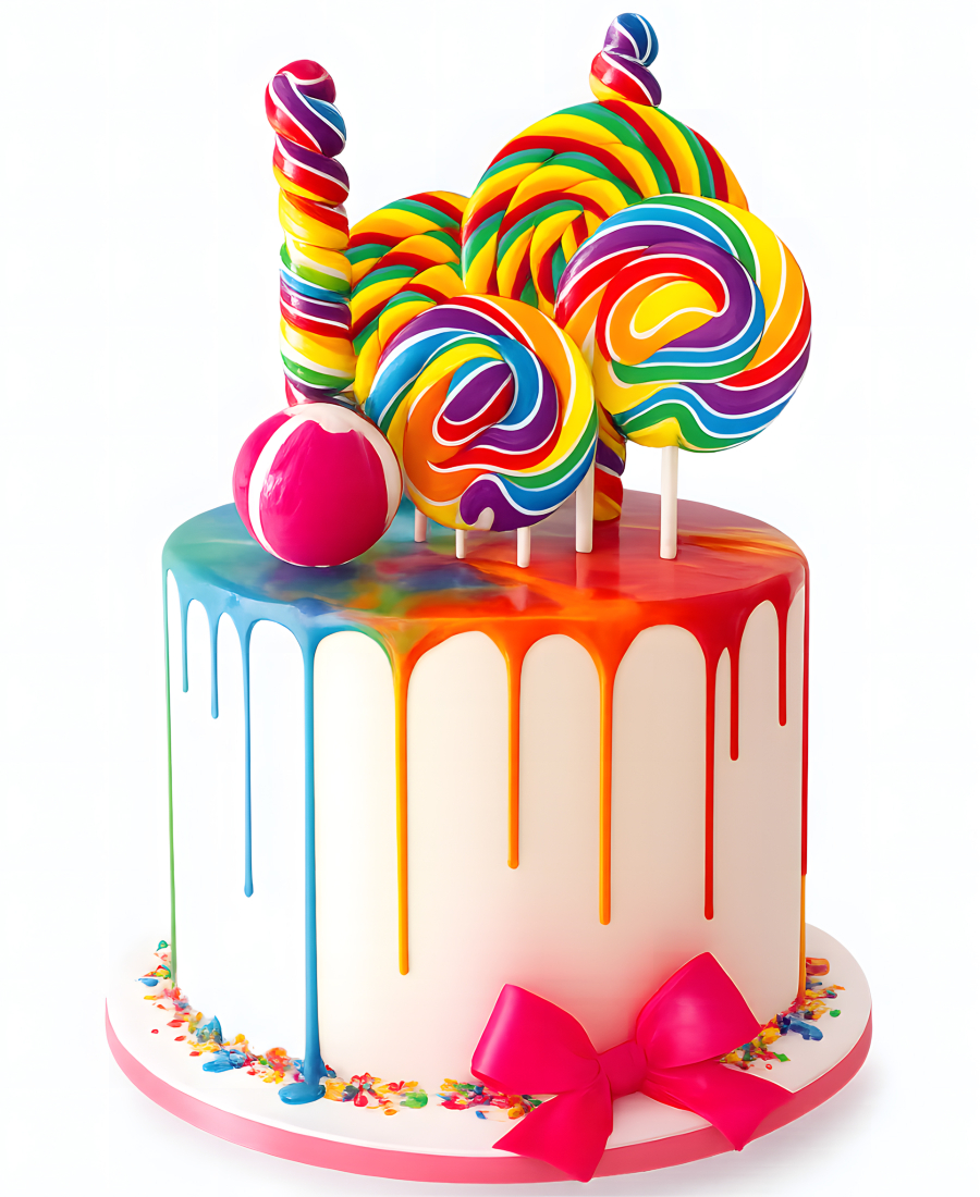 Этот торт — настоящий взрыв красок! Нежные пастельные оттенки сливочного крема создают мягкий фон для ярких леденцов, которые словно драгоценные камни рассыпаны по всей поверхности. Игривые завитки и воздушные пики крема добавляют динамики, создавая ощущение праздника и беззаботности. Каждый элемент композиции гармонично сочетается, даря ощущение детской радости и волшебства.