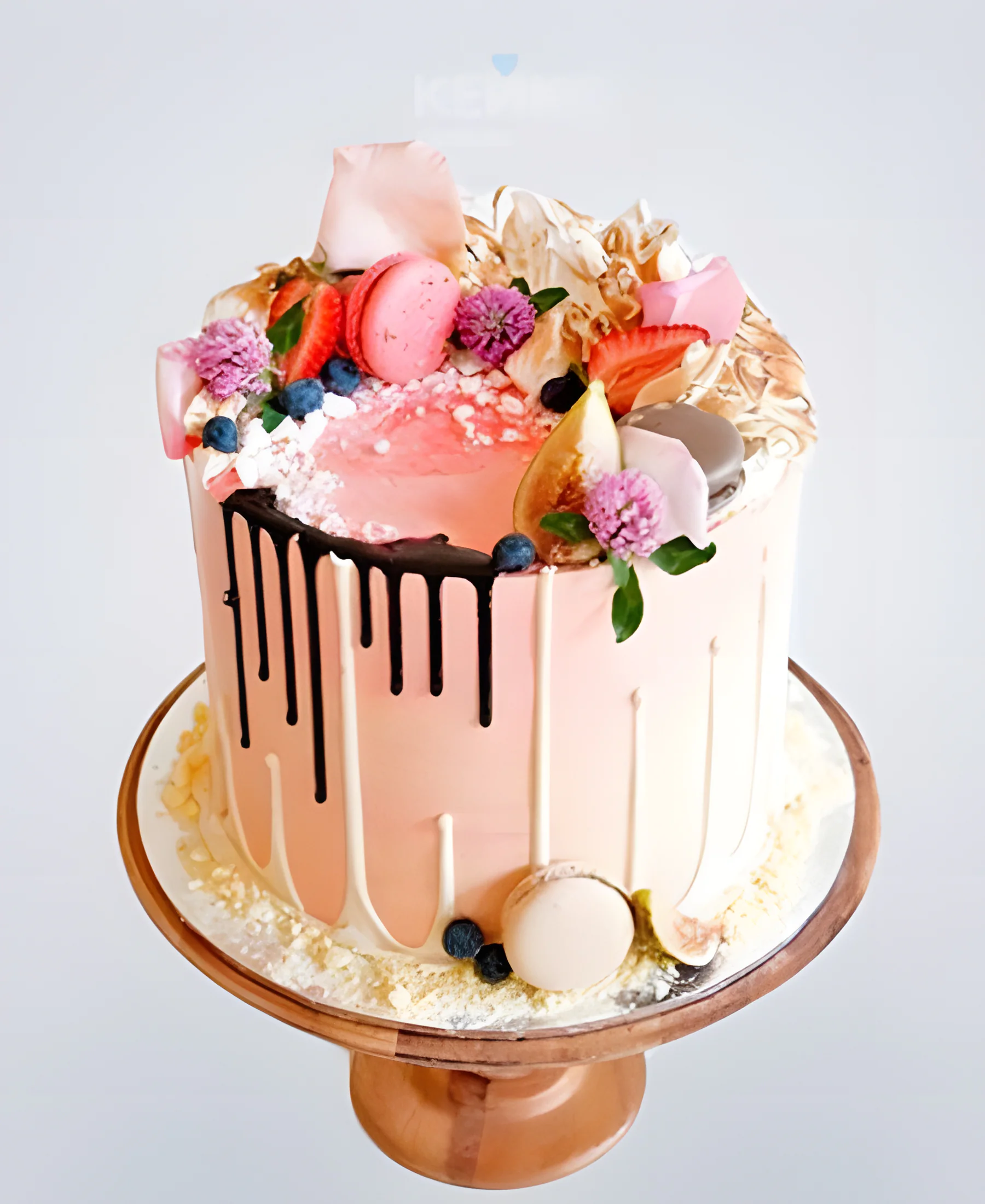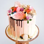 Розовый торт с цветами и фруктами