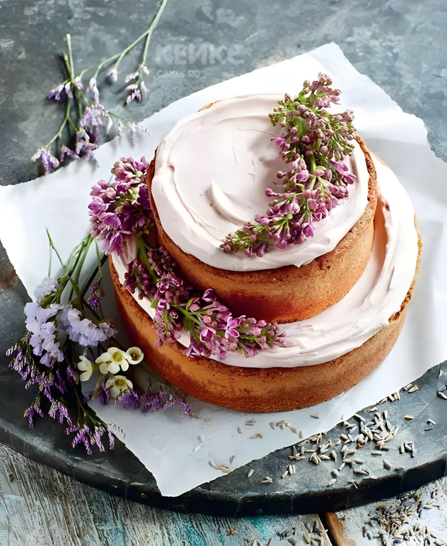 Розовый торт в стиле рустик с сиренью