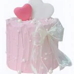 Нежный розовый торт в пастельных тонах приковывает взгляд изящной композицией. Два переплетенных сердца из крема создают романтичный образ, дополненный россыпью жемчужин. Элегантный шелковый бант добавляет торжественности, а бархатистая текстура покрытия напоминает дорогой фарфор. Каждая деталь продумана до мелочей, создавая гармоничный визуальный образ, полный нежности и изысканности.