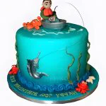 Этот торт переносит нас на берег тихой реки. Фигурка рыбака в шляпе сосредоточенно держит удочку, а вокруг него на голубой глади «воды» из глазури плавают объемные рыбки. Борта украшены камешками из марципана и тростником из мастики. Пастельные оттенки голубого, бежевого и зеленого создают умиротворяющую атмосферу летнего дня. Деревянный мостик из шоколада добавляет композиции завершенности.