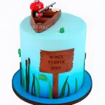 Этот торт — настоящая ода рыбацкому увлечению! На нежно-голубой глазури, напоминающей водную гладь, расположились миниатюрные удочки, катушки и даже симпатичный улов. Деревянная дощечка с надписью «С Днём Рождения» добавляет уютный рустикальный шарм. Торт выглядит так, будто его только что принесли с берега тихой речки — свежий, атмосферный и полный духа приключений.
