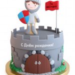 Торт с фигуркой рыцаря с щитом на крыше замка
