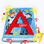 Квадратный торт в нежных пастельных тонах с милым декором в стиле винтажного букваря. На поверхности — трогательные иллюстрации с буквами и цифрами, окруженные изящными листочками. Бежевые и кремовые оттенки создают теплую, уютную атмосферу, напоминающую страницы старой детской книги. Каждый элемент композиции излучает ностальгическое очарование и душевность.