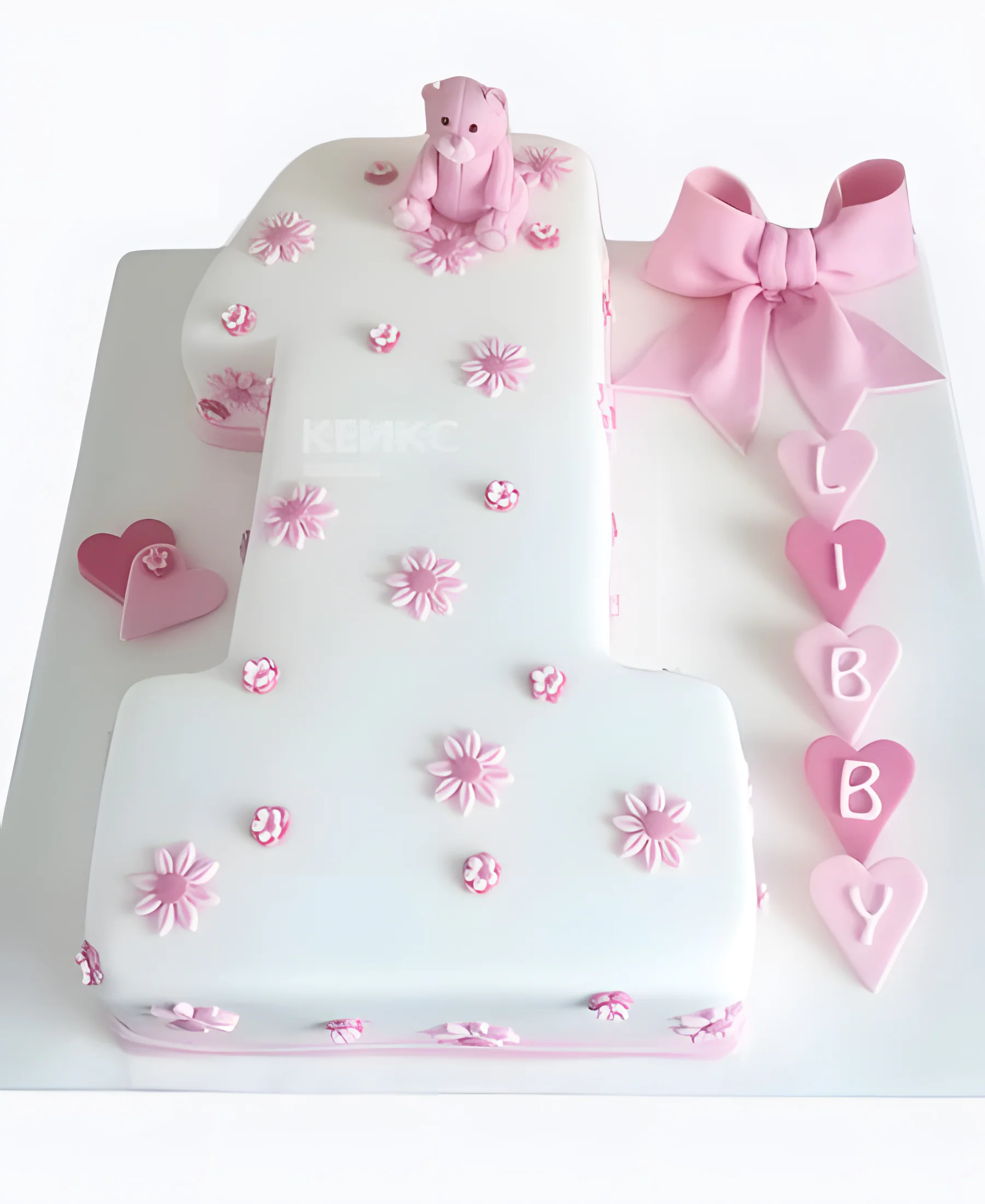 Белый торт с розовым медведем в цветах