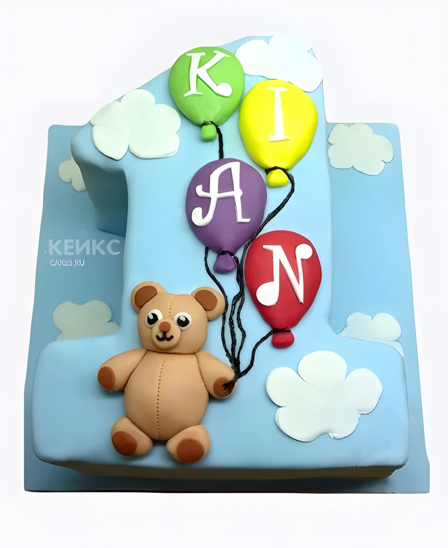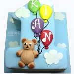 Торт голубой с медведем и разноцветными шарами