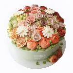 Нежный круглый торт, утопающий в пышных цветах из крема. Пастельная зелень мастики создает мягкий фон, на котором распускаются объемные цветочные композиции. Каждый лепесток тщательно проработан, создавая ощущение свежести и легкости. Цветовая гамма построена на переходах мятных оттенков, что придает торту воздушность и весеннее настроение. Роскошные кремовые розы и мелкие бутоны образуют живописную композицию, напоминающую цветущий сад.
