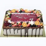 Наш прямоугольный фруктовый торт с ванильным кремом — обязательное блюдо для любого торжества! Он покрыт вкусной шоколадной глазурью и украшен большим количеством черники и черной смородины, которые придают ему свежесть и небольшую кислинку.