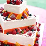 Этот квадратный торт украшен свежей малиной и дикой черникой, покрыт шоколадной глазурью и маленькими миндальными печеньями, которые придают ему необычный вид.