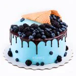 Нежный круглый торт в пастельных тонах с изящной текстурной отделкой. Белоснежная мастика украшена тонкими золотистыми линиями, создающими ощущение лёгкости и изысканности. Сверху — живописная композиция из свежей голубики и ежевики, дополненная элегантным шоколадным рожком. Лаконичный и утончённый десерт, который восхищает своей гармоничной эстетикой.