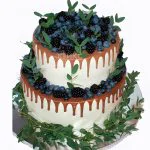 Нежный двухъярусный торт в пастельных тонах. Верхний ярус украшен изящной голубикой, создающей живописную композицию. Нижний ярус обрамлен тонкими золотистыми линиями, добавляющими торжественности. Сочетание лавандового и кремового оттенков создает воздушную, летнюю атмосферу. Каждая деталь продумана до мелочей, образуя гармоничный образ природной элегантности.