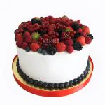 Нежный белоснежный торт украшен сочными гроздьями красной смородины, создавая яркий контраст. Рассыпанные ягоды и листочки выглядят свежо и натурально, будто только собраны с куста. Легкая небрежность в декоре придает торту особое очарование и летнее настроение.