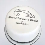 Элегантный круглый торт в корпоративной цветовой гамме Mercedes. На белоснежной мастике чётко выделяется знаменитый трёхлучевой логотип, выполненный методом фотопечати. Серебристые акценты по бортику гармонично дополняют строгий дизайн. Сдержанная роскошь и безупречное исполнение создают впечатление статусного десерта для особых мероприятий.