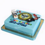 Квадратный торт в нежно-голубых и белых тонах выглядит стильно и современно. Гладкая мастика создает элегантную основу, а золотистые акценты добавляют торжественности. Фигурки из мастики в виде персонажей или символов придают торту индивидуальность и игривое настроение. Логотип, выполненный с четкими линиями, делает торт узнаваемым и подчеркивает его корпоративный или тематический характер. Сочетание лаконичных форм и детализации создает гармоничный образ, который запомнится гостям.