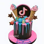 Специально для вас наши кондитеры создали этот эксклюзивный черно-розовый торт. На нем изображен логотип ТикТок, выполненный с помощью фотопечати, плюс дополнительно торт украшен сладостями.