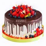 Нежный круглый торт в пастельных тонах притягивает взгляд своей воздушной текстурой. Белоснежный крем создает эффект легкой облачности, а россыпь спелой малины и голубики добавляет ярких акцентов. Ягоды расположены живописными группами, напоминая о летнем луге. Композиция выглядит естественно и романтично, будто создана самой природой.