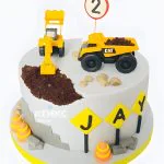 Этот торт — настоящая песочница в миниатюре! На нежно-голубой мастике, напоминающей небо, рассыпан «песок» из крошки, а по нему едут яркие машинки. Желтый экскаватор, красный грузовичок и синий трактор выглядят так, будто только что выехали из детской игры. По краям — аккуратные зеленые «кустики» из мастики, добавляющие ощущение летнего луга. Торт словно создан для того, чтобы перенестись в мир детских фантазий, где каждый кусочек — это новое приключение.