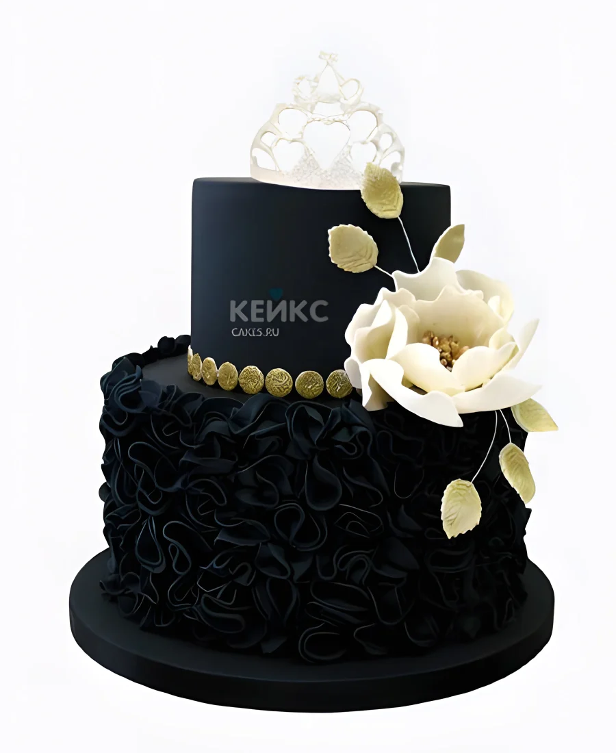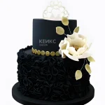 Торт с черной мастикой и большим белым цветком с золотыми бусами