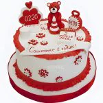 Нежный круглый торт в красно-белой гамме притягивает взгляд своей элегантностью. Белоснежная мастика создает идеальный фон для ярких красных сердечек и милого плюшевого мишки. Трогательные надписи «С днем рождения» и имя именинника добавляют персонализированную нотку. Композиция выглядит гармонично и празднично, вызывая улыбку и создавая атмосферу тепла. Сочетание классических цветов и милых деталей делает этот торт настоящим центром внимания.