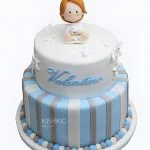 Нежный двухъярусный торт в пастельных тонах украшен изящными полосками и золотистыми акцентами. Верхний ярус венчает трогательная фигурка спящего ангелочка в облаках. Сочетание персикового, мятного и кремового оттенков создает воздушную, почти невесомую композицию. Золоченые детали и тонкие линии добавляют торжественности, напоминая о самом светлом и радостном событии.
