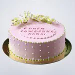 Розовый торт с зелеными цветами и надписью