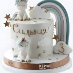 Этот торт — настоящая сказка! На белоснежном фоне раскинулась яркая радуга, а по бокам расположились два очаровательных единорога. Их гривы переливаются пастельными оттенками, создавая волшебную атмосферу. Золотые рожки и аккуратные детали добавляют торту изысканности. Радуга, выполненная в сочных тонах, словно приглашает в мир детских грез. Торт выглядит легким, воздушным и очень праздничным.
