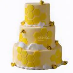 Нежный круглый торт, украшенный изящными золотистыми сотами и милыми пчелками. Белоснежная глазурь создает облачный фон, на котором ярко выделяются медовые оттенки декора. Каждая деталь проработана с любовью — от ажурных сот до забавных крылышек насекомых. Легкая и воздушная композиция напоминает солнечный летний день на цветущем лугу, даря ощущение беззаботности и радости.