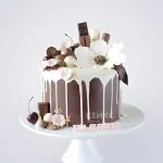 Этот вкусный шоколадный торт с вишнево-ягодной начинкой станет идеальным угощением на день рождения. Он украшен снаружи большим количеством конфет, а также свежими ягодами малины и клубники, которые подарят торту приятную кислинку.