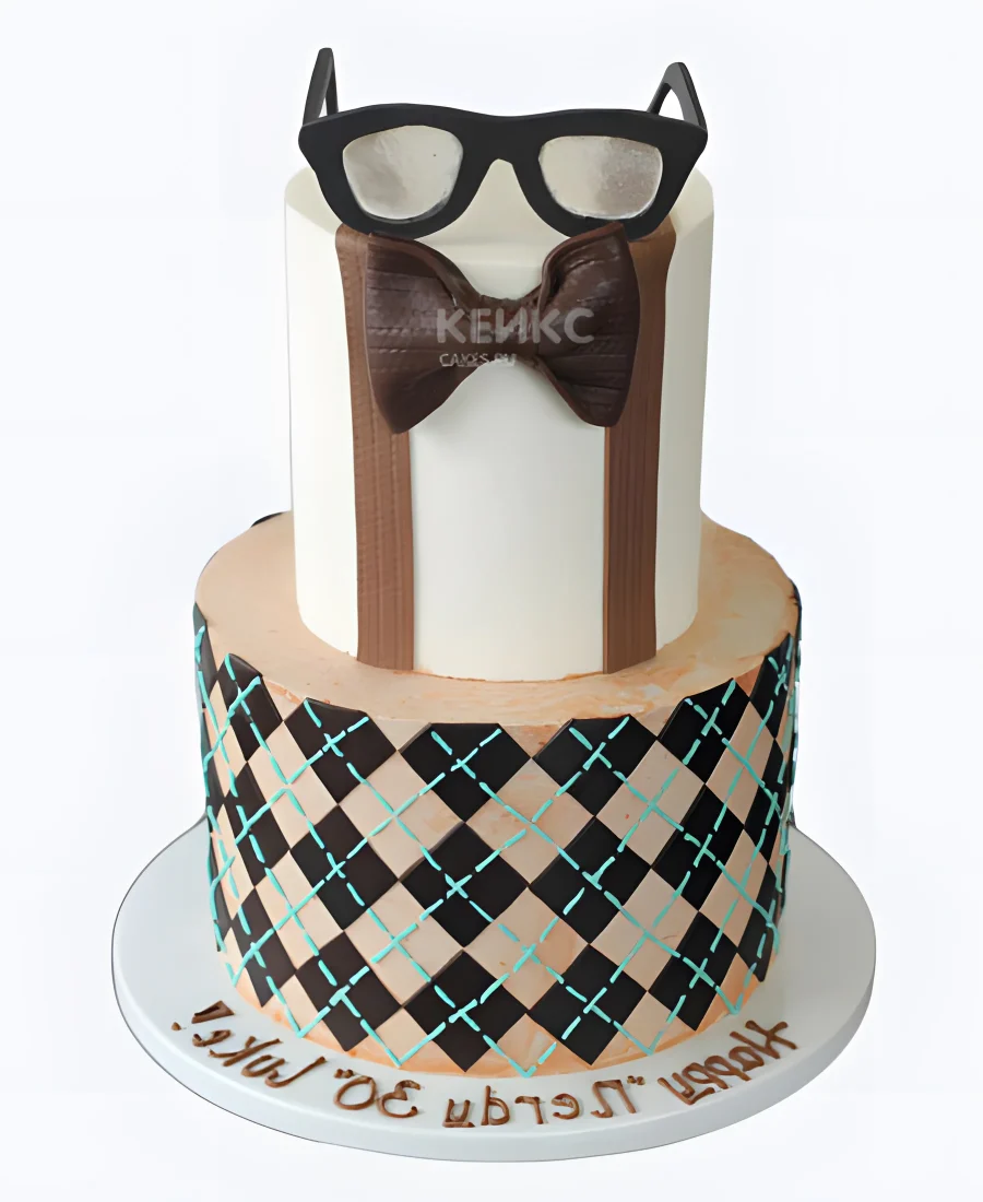 Стильный торт с коричневой бабочкой и очками