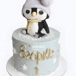 Этот торт — настоящее зимнее чудо! На белоснежной мастике расположился очаровательный пингвин в ярко-синем костюмчике и шапочке с помпоном. Его черные глазки-бусинки и оранжевый клюв придают торту трогательную выразительность. Вокруг — рассыпанные снежинки и легкие сугробы из сахарной пудры, создающие атмосферу новогоднего волшебства. Контраст белого, синего и черного делает торт графичным и стильным, а милый персонаж вызывает улыбку.