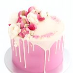 Ярко-розовый торт с белой глазурью и цветами