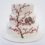 Нежный торт в пастельных тонах с изящной веткой цветущей сакуры, спускающейся по ярусам. Белоснежный фон украшен тонкими золотыми линиями, создающими ощущение лёгкости и воздушности. Две миниатюрные птички на верхнем ярусе добавляют трогательную ноту весенней гармонии. Розовые цветы и бутоны сакуры искусно расположены вдоль всей композиции, передавая хрупкую красоту японской природы.